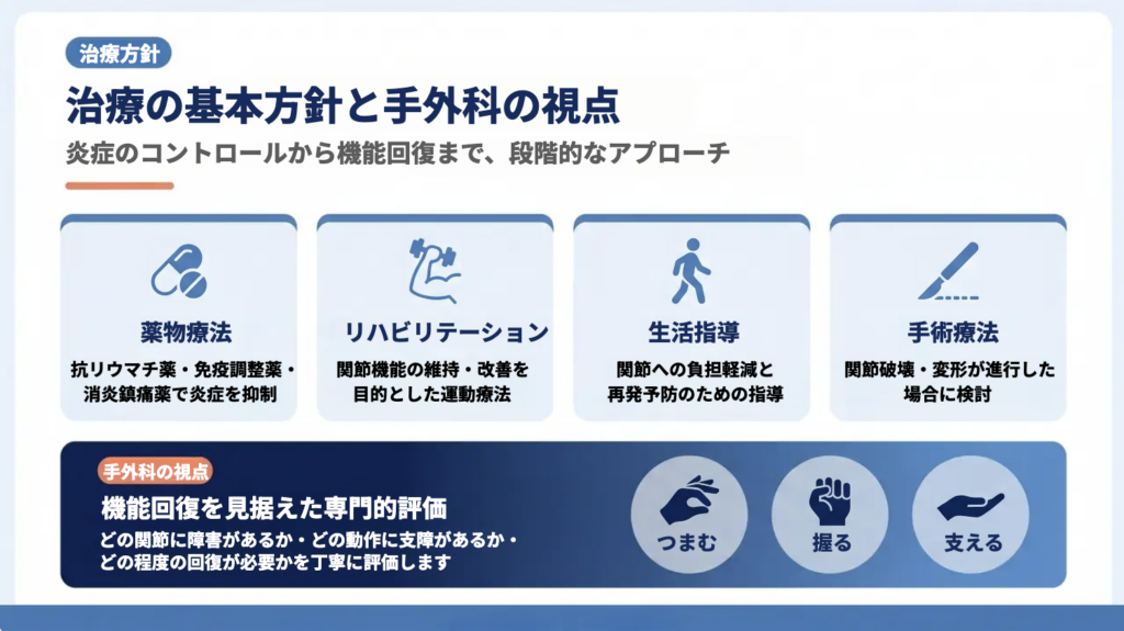 高月整形外科病院・手外科では、炎症のコントロールと機能回復の両立を目的として、症状の程度や進行度に応じた段階的な治療を行っています。これは全国の方にとっても重要な考え方であり、早期から適切な治療を開始することが、将来的な関節機能の維持につながります。