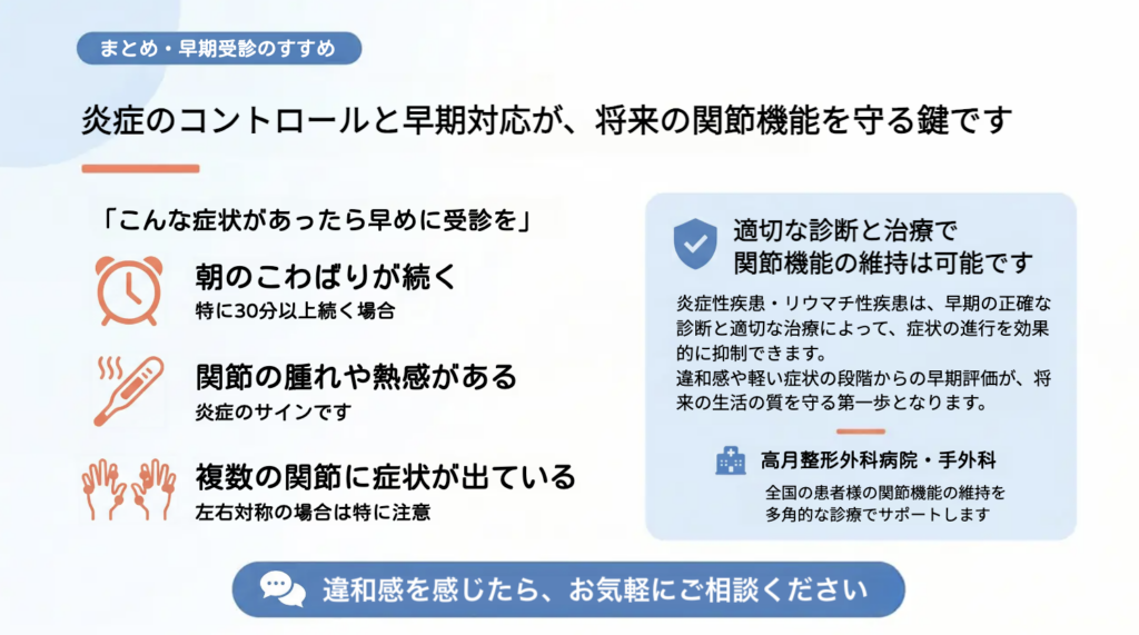 炎症のコントロールと早期対応が、将来の関節機能を守る鍵です