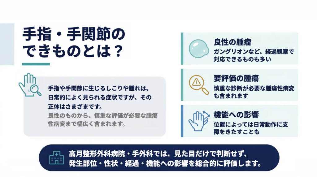 によって、考えるべき疾患は異なります。高月整形外科病院・手外科では、東京で手指・手関節のできものに悩む方に対して、単に見た目の問題としてではなく、良性か悪性疑いか、そして手の機能にどのような影響を与えるかまで含めて丁寧に評価していきます。