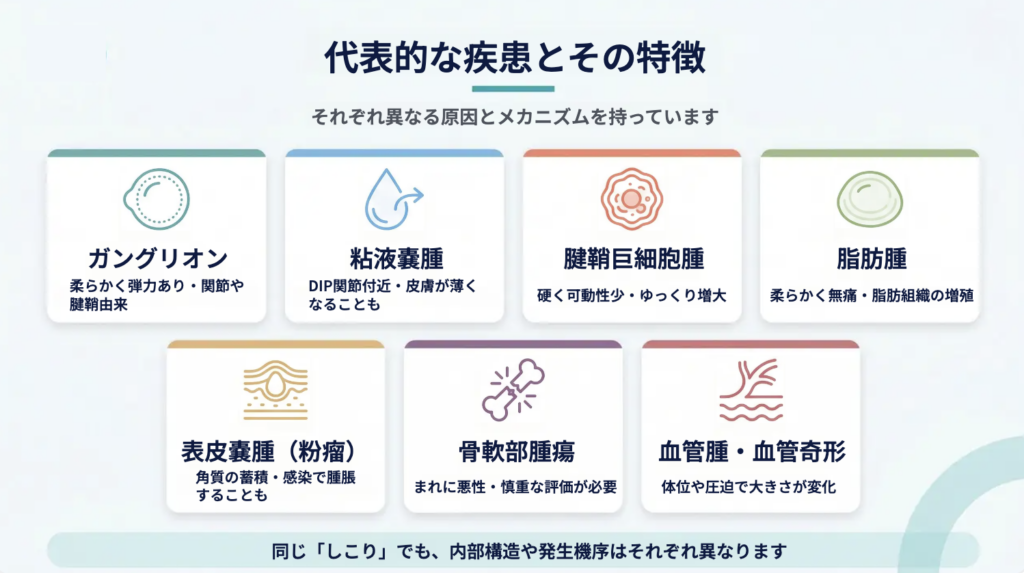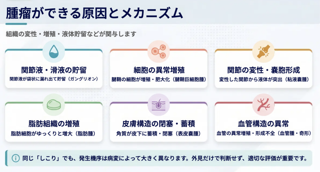 同じ「しこり」に見えても、原因と発生メカニズムはそれぞれ異なります