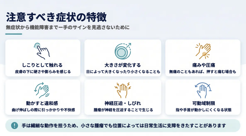 こうした腫瘍・腫瘤性病変は、単に見た目の問題だけではありません。発生する部位によっては、神経や腱、関節の動きに影響し、痛み、しびれ、動かしにくさ、可動域制限などにつながることがあります。特に手は、つまむ、握る、持つといった繊細な動作を担う部位であるため、小さなしこりであっても、生活の中では大きな不便として感じられることがあります。