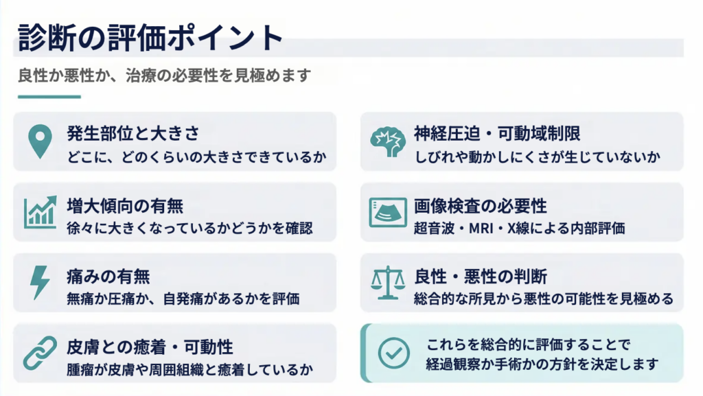 といった特徴がある場合には、単なる良性病変ではなく、より慎重な評価が必要になります。特に、頻度は高くないものの、骨軟部腫瘍のように画像検査や精密な診断を要する病変もあるため、見た目だけで自己判断しないことが大切です。