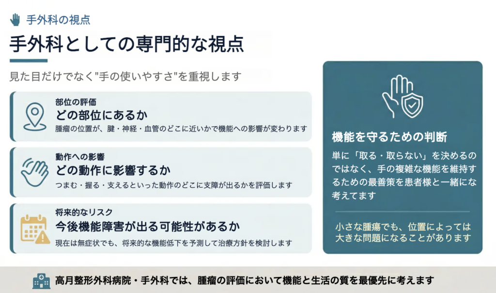 小さな腫瘤であっても、位置によっては大きな機能障害につながる可能性があります。そのため、見た目だけで判断するのではなく、「手の使いやすさ」という観点を重視することが重要です。