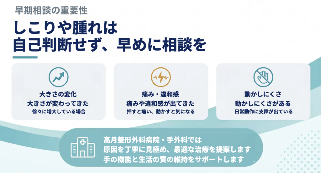 手のしこりは、見た目の変化として気づかれることが多い一方で、本当に大切なのは、今後どのような影響が出る可能性があるかという点です。