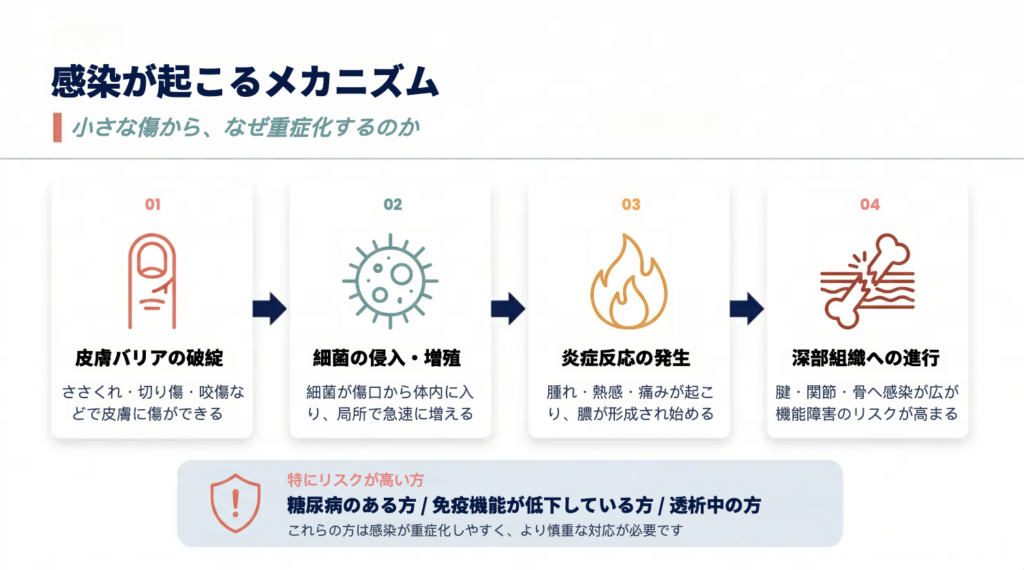 小さな傷からでも、感染は深部へ広がり重症化することがあります