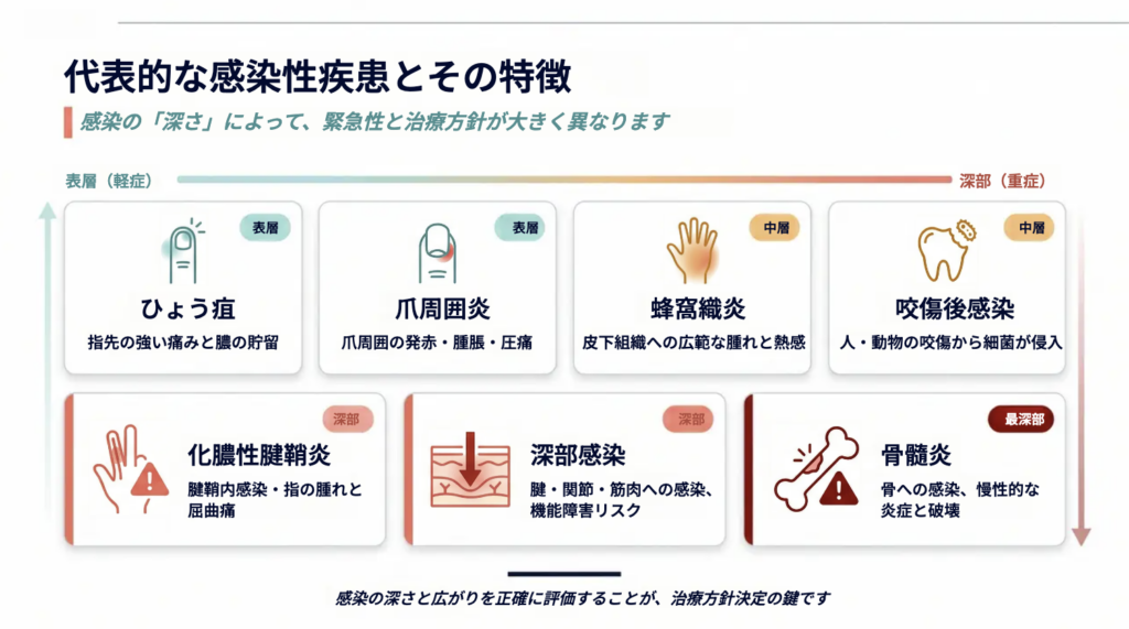 感染の深さと進行速度を見極め、手の機能を守ることが重要です