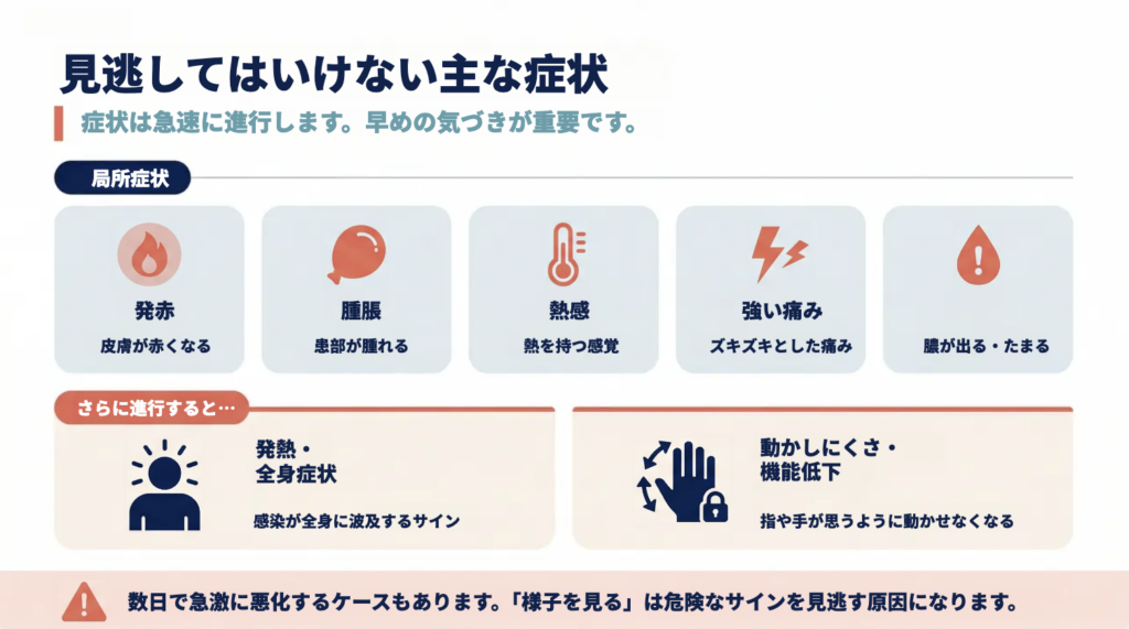 特に手は外界との接触が多く、日常生活の中で小さな傷を受けやすい部位です。そのため、見た目には軽い傷であっても、内部では細菌が増殖し、炎症が急速に進行することがあります。初期には軽い赤みや違和感程度であっても、時間の経過とともに腫脹や疼痛が強くなり、場合によっては膿の形成や深部組織への感染拡大を伴うこともあります。