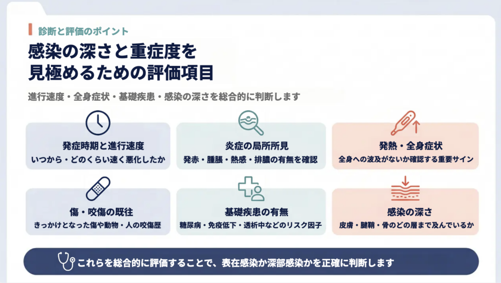 といった点を総合的に判断し、単なる表在感染か、深部へ広がるリスクがある状態かを見極めていきます。