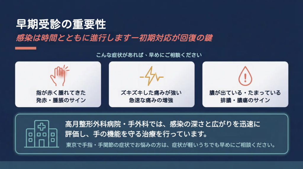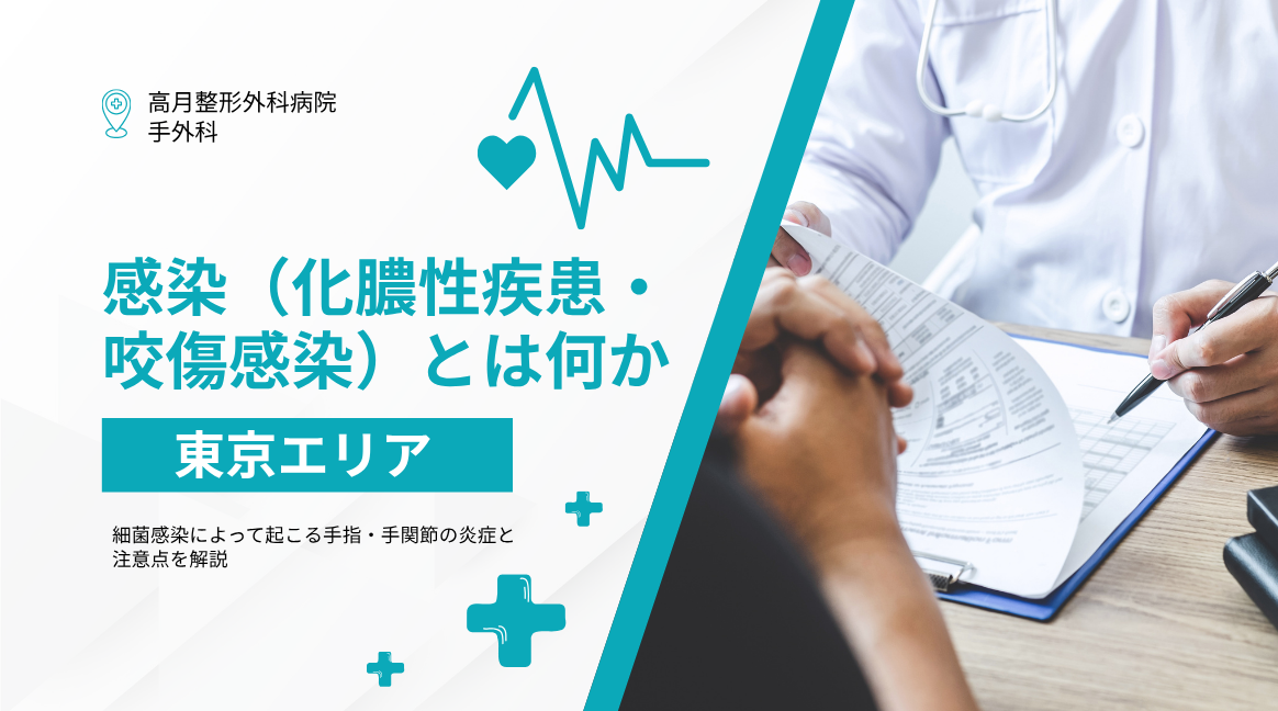 東京で手指・手関節の症状に不安がある方は、症状が軽いうちでも、高月整形外科病院・手外科へご相談ください。早期受診が、感染の進行を防ぎ、手の機能を守るための第一歩になります。