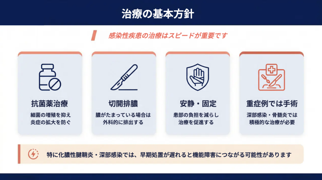 表在感染であれば保存的治療で改善することもありますが、腱鞘や骨に及ぶ感染では、外科的治療が必要になるケースもあります。